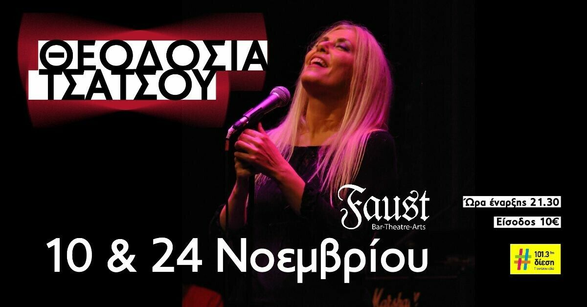 H Θεοδοσία Τσάτσου, μετά από μακρόχρονη απουσία, επιστρέφει στις ζωντανές εμφανίσεις. Η αγαπημένη ερμηνεύτρια θα χαρίσει στο κοινό δύο μοναδικές βραδιές στην ατμοσφαιρική σκηνή του Faust την Τετάρτη 10 και 24 Νοεμβρίου.