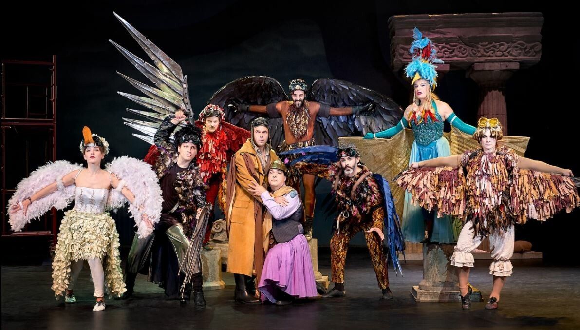 μάχη ενάντια στον πολεμοχαρή στρατηγό Λάμαχο. Στο δεύτερο μέρος, παρουσιάζεται «Ο Πλούτος», όπου ο Αριστοφάνης παραδίδει μαθήματα πολιτικής οικονομίας, καθώς ο ομώνυμος ήρωας είναι τυφλός και δεν βλέπει πού δίνει τα αγαθά του, με αποτέλεσμα να χαρίζει πλούτη στους κακούς. Όμως, όταν ξαναβρίσκει το φως του, γίνεται δίκαιος, κάνοντας μόνο τους καλούς να πλουτίσουν. Τέλος, παρουσιάζονται οι «Όρνιθες»: Δύο Αθηναίοι, ο Ευελπίδης και ο Πεισθέταιρος, απογοητευμένοι από τη ζωή της πόλης, ψάχνουν έναν ήσυχο τόπο. Πηγαίνουν στη χώρα των πουλιών, ιδρύουν μαζί μ’ αυτά μια φανταστική πολιτεία, την Ουρανούπολη, μια κοινωνία ελεύθερη, δίκαιη, με φαντασία, ανοιχτή για όλους στο όνειρο και τις ευκαιρίες.
